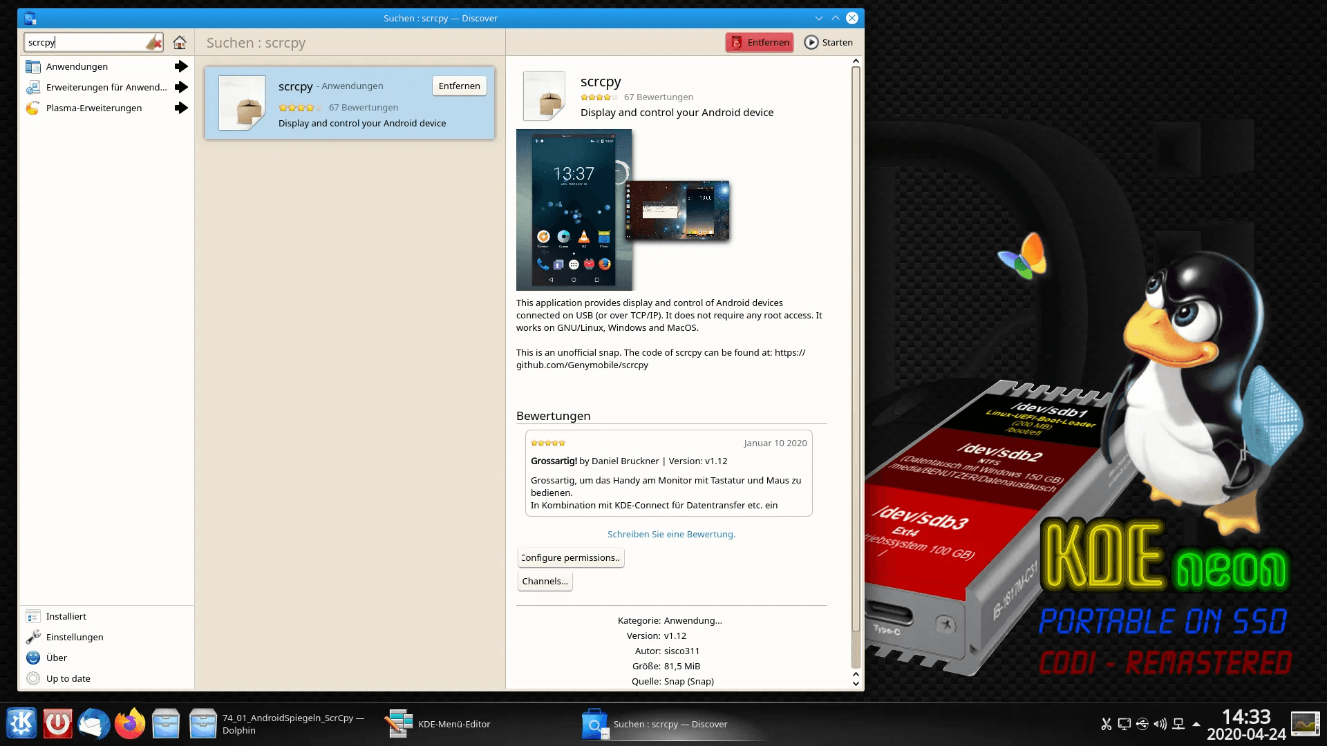 KDEneon / Kubuntu – ScrCpy mit Discover installieren und Starteintrag im K-Menü erstellen