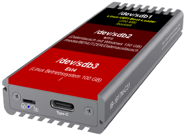 - Die externe NVMe (Linux) sdb1, sdb2, sdb3
